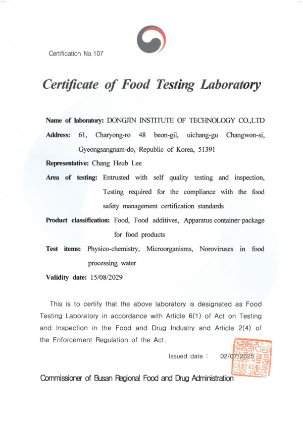 Certificate of Food Testing Laboratory > 인증서 | (주)동진생명연구원