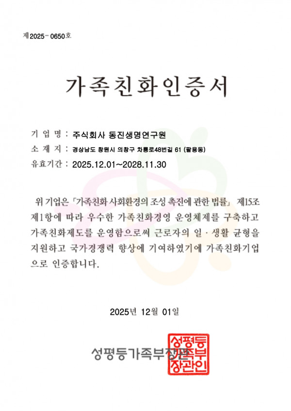 가족친화인증서 > 인증서 | (주)동진생명연구원