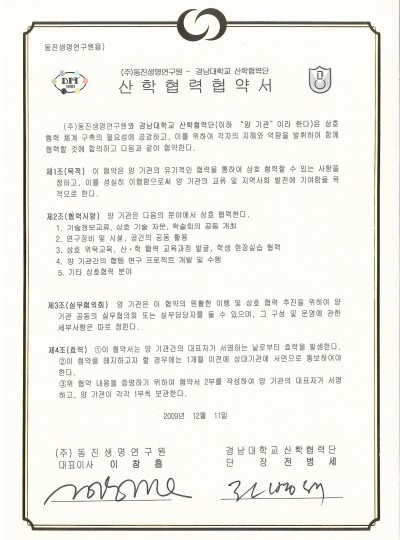 경남대학교 산학협력단 산학협력 협약서 > 인증서 | (주)동진생명연구원