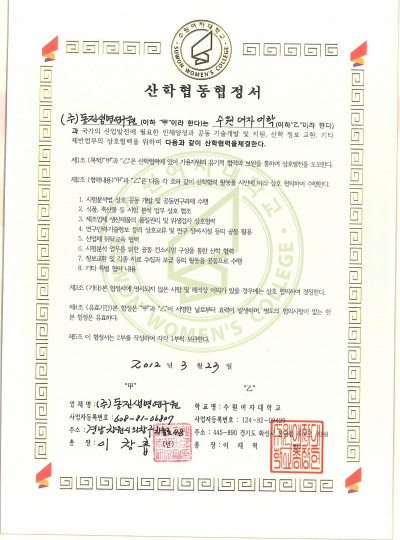 수원여자대학 산학협동 협정체결 > 인증서 | (주)동진생명연구원