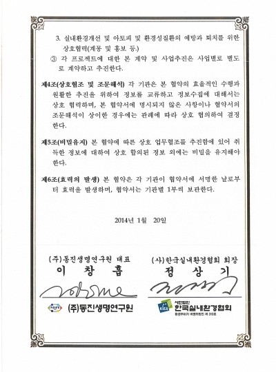 (사)한국실내환경협회 산학협정체결 -2- > 인증서 | (주)동진생명연구원