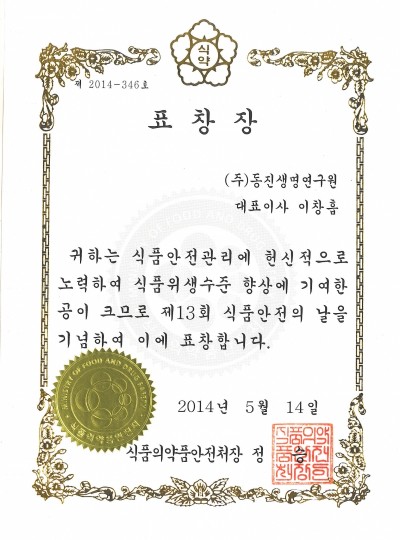 제13회 식품안전의 날 표창장수여 > 인증서 | (주)동진생명연구원