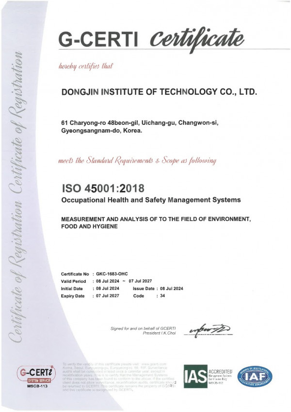 ISO45001 Occupational Health and Safety Management System > 인증서 | (주)동진생명연구원