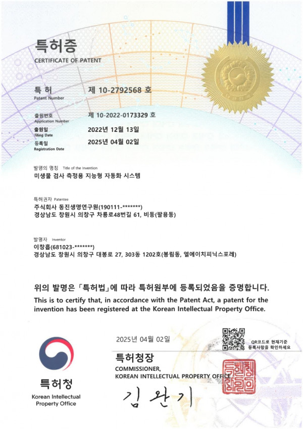 미생물 검사 측정용 지능형 자동화 시스템 특허증 > 인증서 | (주)동진생명연구원