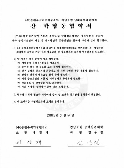 경상남도립남해전문대학 산학협동 협약 체결 > 인증서 | (주)동진생명연구원