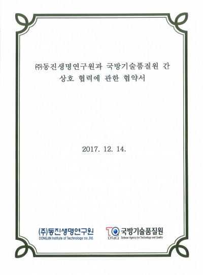 국방기술품질원과 상호협력 협약서 > 인증서 | (주)동진생명연구원