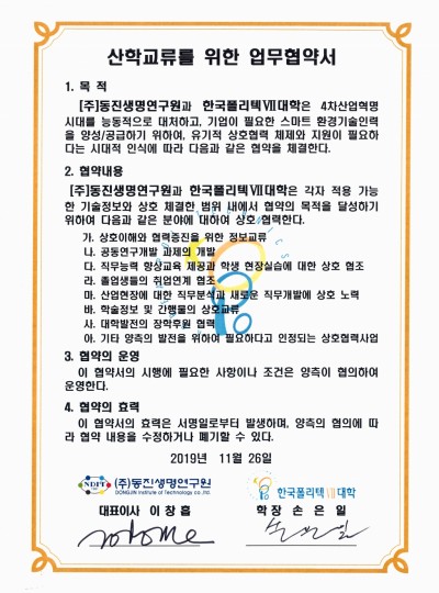 한국폴리텍대학 창원캠퍼스와 업무협약 > 인증서 | (주)동진생명연구원