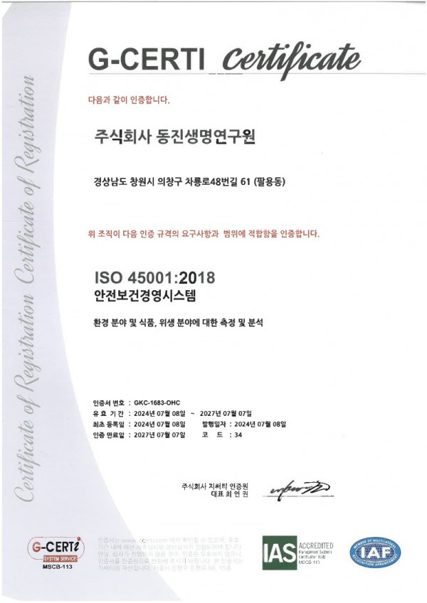 ISO45001 안전보건경영시스템 인증 > 인증서 | (주)동진생명연구원