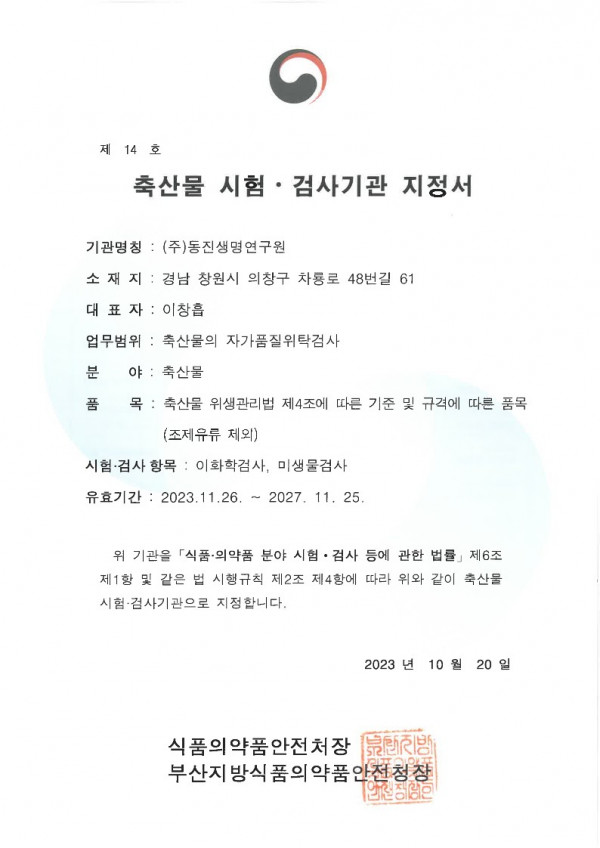 축산물 시험·검사기관 지정서 > 인증서 | (주)동진생명연구원